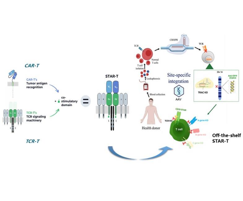 Off-the-shelf STAR-T Platform adopts the CRISPR-Cas9 gene-editing system and adeno-associated virus (AAV)-mediated site-specific integration strategy, which eliminates the risk of random genomic insertion and improves product safety. Meanwhile, it mitigates graft-versus-host disease (GVHD) and host-versus-graft reaction (HVGR) risks of universal products, enhances the cells’ resistance to immunosuppression and cytotoxicity, and features a clear drug development prospect.